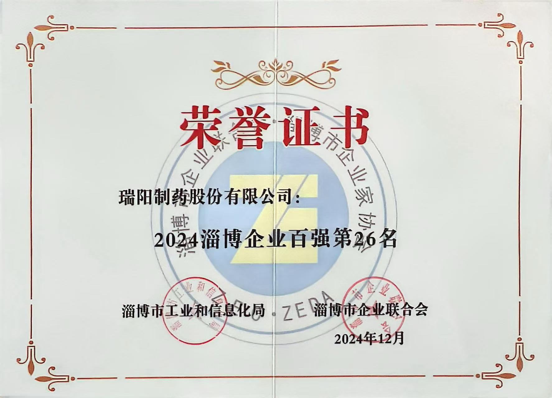 12月27日,2025淄博市企业家年会暨高质量发展座谈会隆重举行。会上,公司被授予2024“淄博企业100强”第26名和“淄博制造业企业100强”第10名的荣誉。公司董事长苗得足代表公司出席会议并领取了奖项。